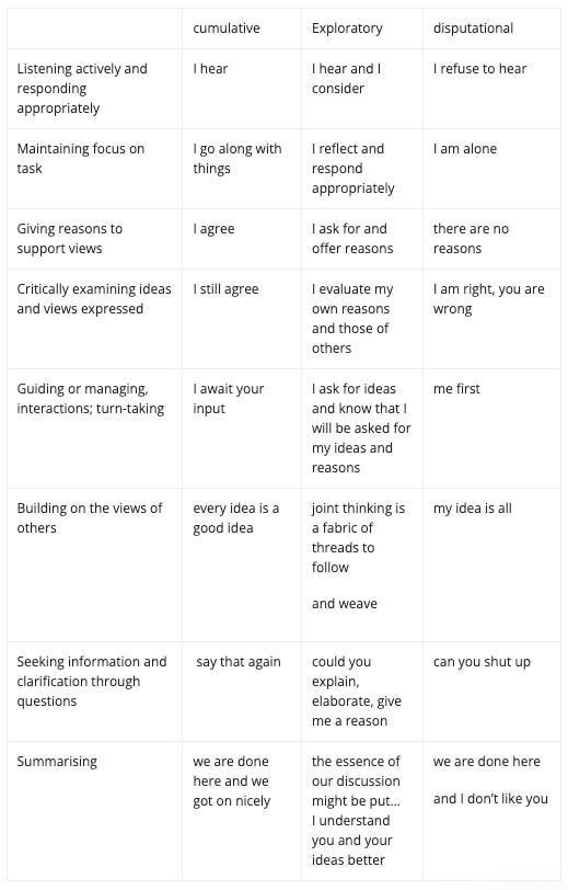 The table below summarises some thought patterns of these three types of talk, using criteria highlighted as necessary for speaking in class from the Oracy Cambridge/Voice21 Oracy Skills Framework.